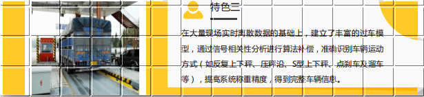 整車式動態汽車衡-系統組成 采用整車稱重的方式獲得車輛總重的動態公路車輛自動衡器,基于先進的高性能嵌入式處理技術,通過實時高速動態采樣,多路信號精細重現不同時刻重量變化,實現單車通行、連續過車等復雜工況下的精準稱重。 1.稱重控制器:由高速處理器、采集單元、電源模塊和通訊接 口高度集成,計算能力強、功耗低、體積小, 是整車動態稱重的核心處理控制設備。 2.秤體單元:由承重臺、U型梁、稱重傳感器、軸感應傳感 器、限位裝置等構成,從設計結構和制造工藝 上大幅增強秤體整體強度和空間平穩性。軸感應傳感器采用剪切梁式傳感器,用于輔助處理 車輛同上同下狀態,以及識別軸型(此時可不 再安裝輪胎識別器)。 3.輪胎識別器:采用壓電式傳感器,感應判斷車輛輪胎數量和類型。 4.稱重傳感器:采用全焊接密封技術,防沖擊、防偏載性能優越的橋式稱重傳感器,安裝方便,性能可靠,適用于重載車輛的頻繁碾壓。 5.紅外車輛分離器:由成對的發射和接收裝置構成,通過檢測判斷車輛是否被紅外光幕遮擋,分離通行車輛。即使在惡劣環境下也可以正常工作,晴天可靠性達到99.9%,雨雪或大霧天氣可靠性優于99%。 6.環形線圈檢測器:車輛檢測器通過電磁感應原理檢測車輛的到來,配合紅外車輛分離器對車輛進行分離和輔助收尾。 主要技術參數 系統特色和功能 系統五大主要功能 |